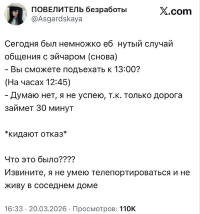 Твиттерские поделились еще одной безумной историей найма — девушку пригласили на офлайн-собес, на который нужно было успеть за 15 минут. В понимании эйчаров «нет ничего невозможного» 🌚
