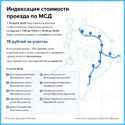 🚗 Проезд по МСД подорожает с 14 марта Московские власти решили «проиндексировать» стоимость проезда по Московскому скоростному диаметру. С 14 марта в часы пик — с 7:00 до 11:00 и с 16:00 до 20:00 по