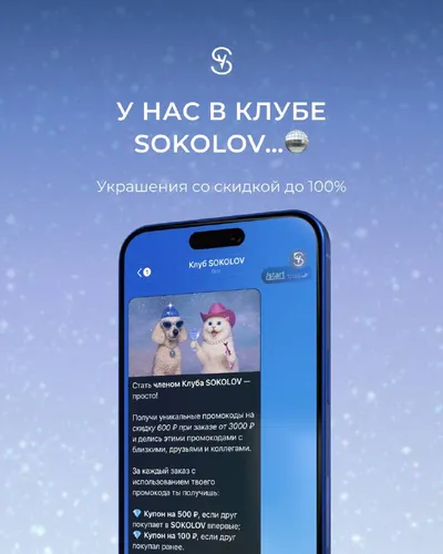 У нас в клубе… 🪩 Украшения со скидкой до 100% 🔥 Клуб SOKOLOV — это телеграм-бот для выгодного шопинга. Друзьям скидка — вам кешбэк на оплату всей суммы покупки. Отправляйте свои персональные пром