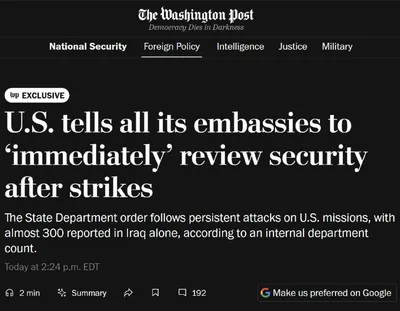 США приказали всем посольствам по всему миру срочно пересмотреть меры безопасности в связи с усиливающимися угрозами, связанными с конфликтом в Иране, после сотен нападений на американские объекты, в