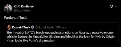 📸 «Запаниковавший Туск», — так Кирилл Дмитриев ответил на публикацию премьер-министра Польши: «Угроза распада НАТО, смягчение санкций против России, масштабный энергетический кризис в Европе, прекра
