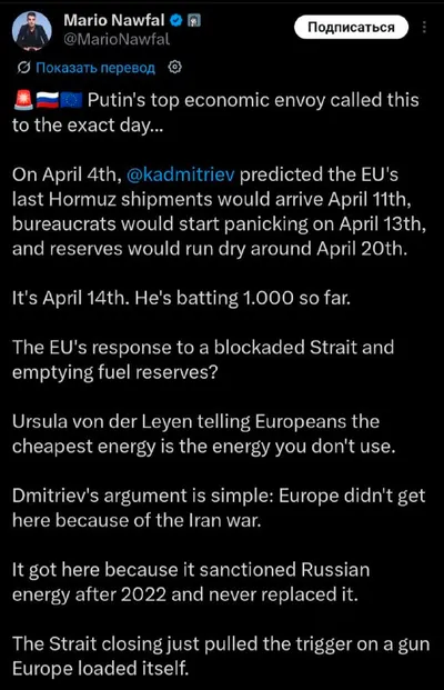 Кирилл Дмитриев поблагодарил известного медиаблогера Марио Науфаля за то, что тот оценил точность его прогнозов. «Спасибо, что указали на мои прогнозы и неверные решения ЕС (отказ от российской и яде