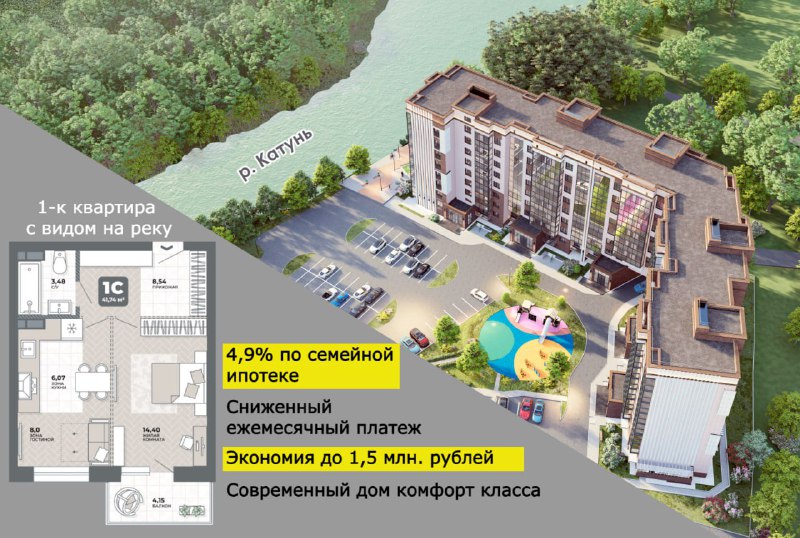 1-к квартира в ЖК "Берег Катуни 3" с видом на реку! Прайд Инвест предлагает просторную студию 41,75 м2 в новом жилом комплексе на берегу Катуни. 🏞 Квартира правильной планировки, с балкона которой о