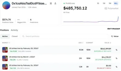😱 ПОДНЯЛ 560 000$ НА ВОЙНЕ! Очередной подозрительный аккаунт на Polymarket был создан в феврале и использовался только для ставок на военные действия США в отношении Ирана! 🤔 В итоге за сегодня ак