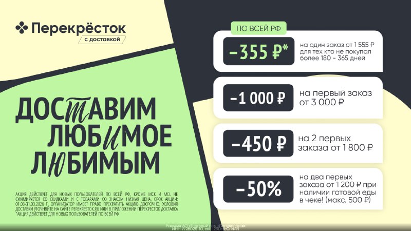 Перекрёсток Доставка — российская сеть супермаркетов, которой управляет X5 Group. На первые заказы: 👉 12XRZFAJ – скидка 50% (не более 500₽) на 2 первых заказа от 1000₽ в Москве и МО при наличии гото