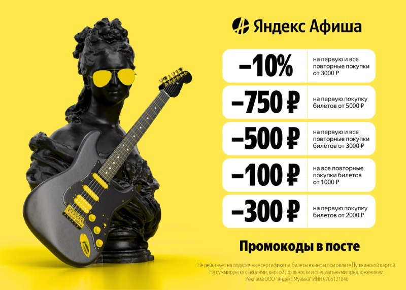 Яндекс Афиша — площадка для поиска билетов на развлекательные мероприятия. Для новых клиентов: 👉 A29589 – скидка 750₽ от 5000₽ по 31.03 👉 AX224443 – скидка 300₽ от 2000₽ по 31.03 Для всех клиентов