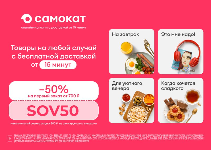 🛴 Самокат — сервис доставки продуктов и других товаров от 15 минут. 🔥 SOV50 – скидка 50% (не более 500₽) на первый заказ от 700₽ по 31.03 https://samokat.prfl.me/sove2u/ire7gi?erid=2RanynzDcv6