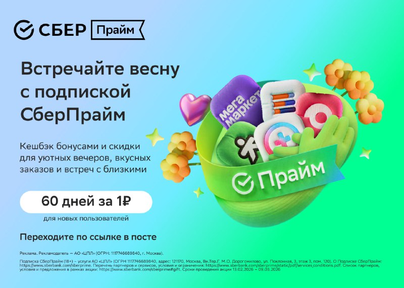 Встречайте весну со СберПрайм Подключайте подписку и выбирайте специальные предложения, чтобы порадовать себя и тех, кто рядом ▪️Купер - бесплатная доставка от 1700₽ ▪️Мегамаркет - скидка 25% на тов
