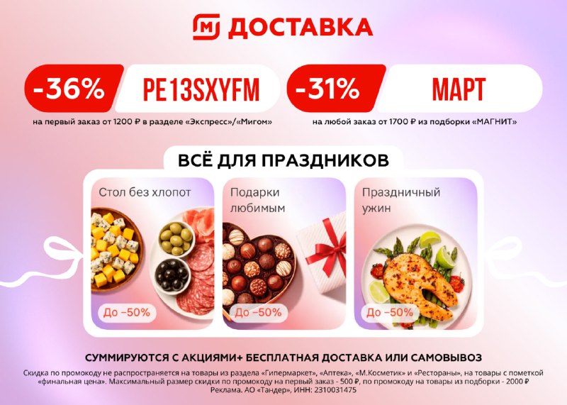 🧲 Магнит — российская сеть розничных магазинов. На первый заказ: 👉 PE13SXYFM – скидка 36% (не более 500₽) на заказ от 1200₽ в Магнит Экспресс/Мигом 31.03 👉 PG119TEIV – скидка 25% (не более 1500₽)