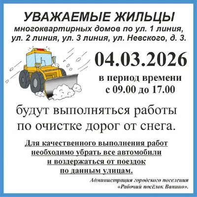 Уважаемые жильцы многоквартирных домов по ул. 1 линия, ул. 2 линия, ул. 3 линия, ул. Невского, д. 3. 04.03.2026 в период времени с 09.00 до 17.00 будут выполняться работы по очистке дорог от снега. Дл