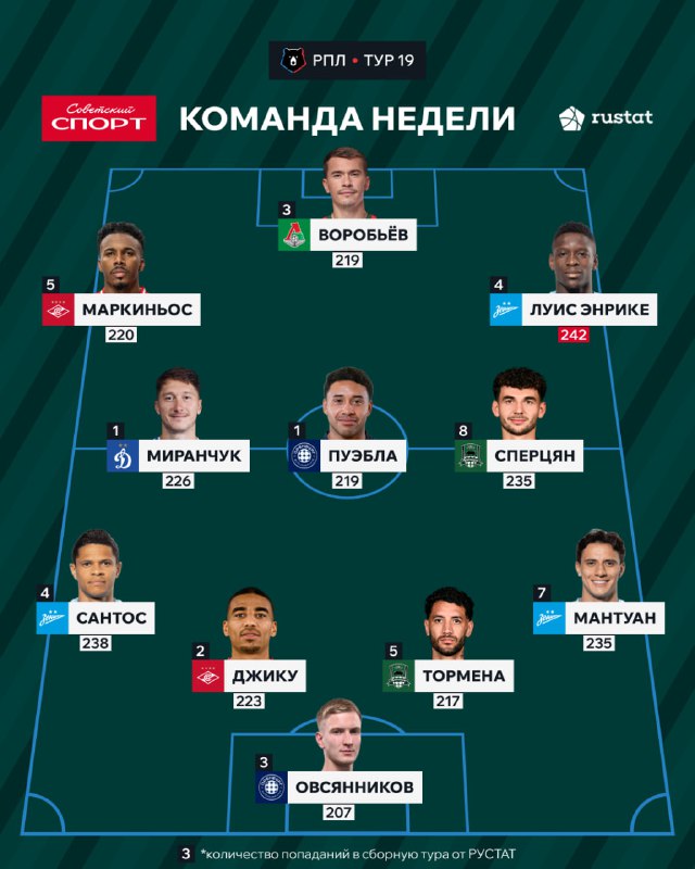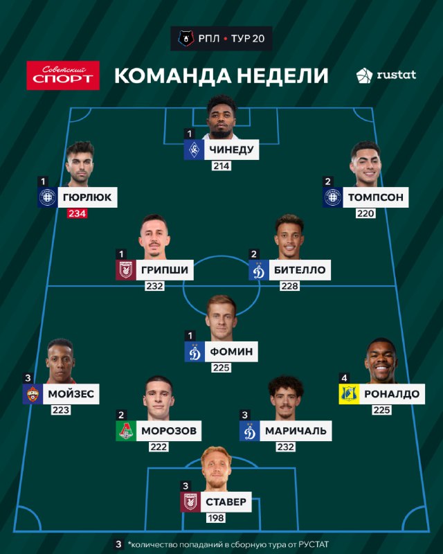 🤩🐻 Смотрим на 11 лучших футболистов прошедшего тура РПЛ! В символическую сборную попали три футболиста «Динамо», по два игрока из «Рубина» и «Оренбурга», а также представители «Локомотива», «Ростов