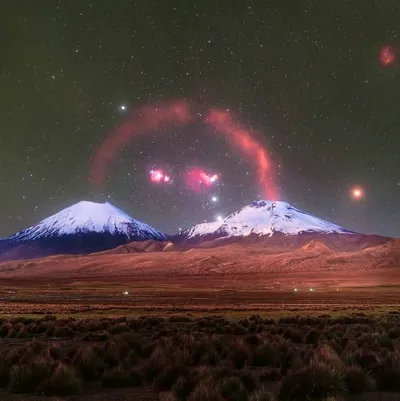 🏔️✨ Боливийские горы и созвездие Ориона, напоминающее затаившийся гигантский смайл. 🙂 Большая красная дуга – это Петля Барнарда, огромная эмиссионная туманность, проходящая через значительную часть