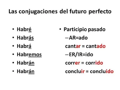 El futuro perfecto en español se forma combinando el verbo auxiliar haber en futuro simple (habré, habrás, habrá, habremos, habréis, habrán) con el participio del verbo principal (terminaciones -ado o
