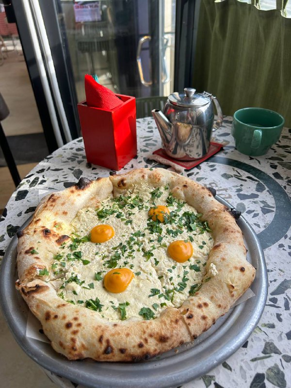 #блюдодня — веганская аджарская пицца в Stay Gold Pizza Spot 🍕 Эта пицца напоминает… ватрушку с творогом! Да, звучит странно, но ощущение именно такое) В основе — тофу-сулугуни, по вкусу и текстуре