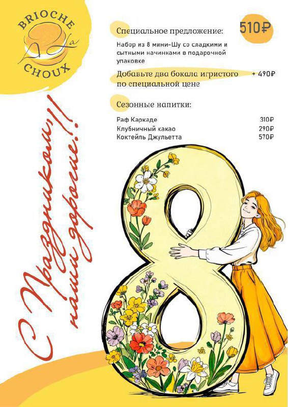 Набор-пазл к 8 марта за 510 ₽ от «Бриошь А Ля Шу» В него входят 8 одинаковых мини-шу с различными начинками: 4 сытные и 4 сладкие, все в красивой упаковке, в лучших традициях этого заведения. Попроб