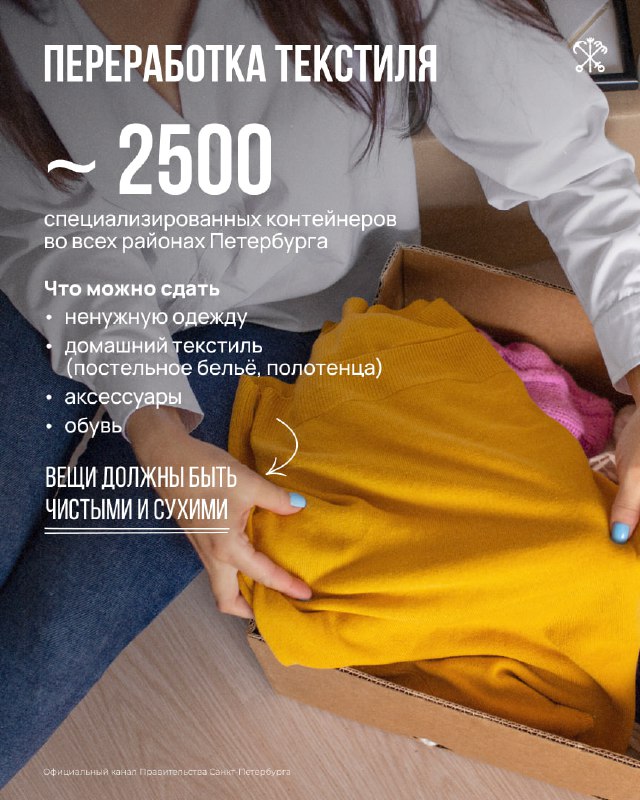 ♻️ Каждый петербуржец может сделать вклад в экологичное будущее — сдать ненужные вещи на переработку. Во всех районах города установлены специальные контейнеры для сбора текстиля. С июля 2025 года о