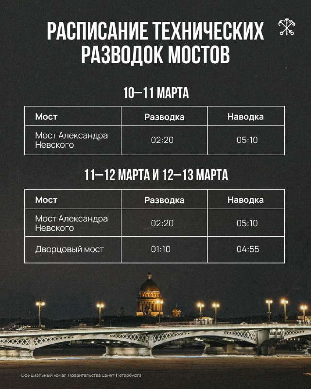 🌉 Петербург готовится к навигации — сегодня ночью стартуют плановые технические разводки мостов. Первым, в ночь с 10 на 11 марта, будет разведён мост Александра Невского. В следующие две ночи к нем
