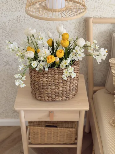 📸 В интерьере покупателя В корзине на фото: 1. Тюльпаны пионовидные. 4 букета (белые 2 + жёлтые 2). 960*4=3840 руб. 2. Живокость белая. 5 веток. 240*5=1200 руб. 3. Фрезия белая. 5 веток. 245*5=1225