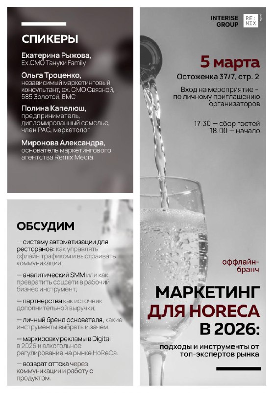 Приглашаем топ-менеджеров вашей компании (управляющих, CEO, СМО, PR директоров) на закрытое мероприятие по маркетингу в HoReCa в 2026 году в офисе маркетингового агентства Remix Media на Остоженке.