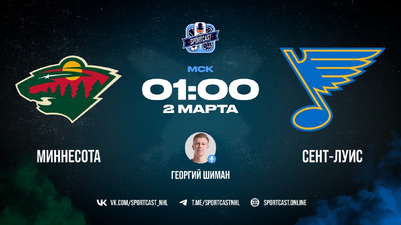 🏒 Миннесота Уайлд – Сент-Луис Блюз 🏒 (01:00 Мск) 🎙 Георгий Шиман 👀 Прямая ссылка / ⚽️ Sportcast.online /📺МатрёшкаТВ /👀 VK Live