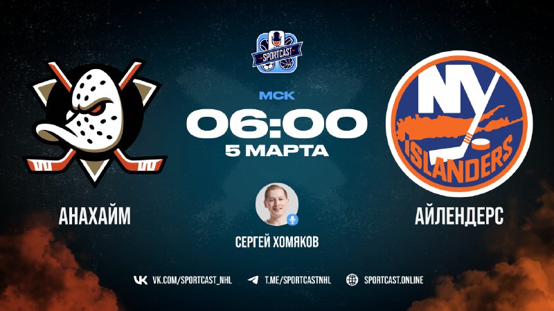 🏒 Анахайм Дакс – Нью-Йорк Айлендерс 🏒 (06:00 Мск) 🎙 Сергей Хомяков 👀 Прямая ссылка / ⚽️ Sportcast.online /📺МатрёшкаТВ /👀 VK Live 🏒 Сиэтл Кракен – Сент-Луис Блюз 🏒 (06:00 Мск) 🎙 Петр Гол