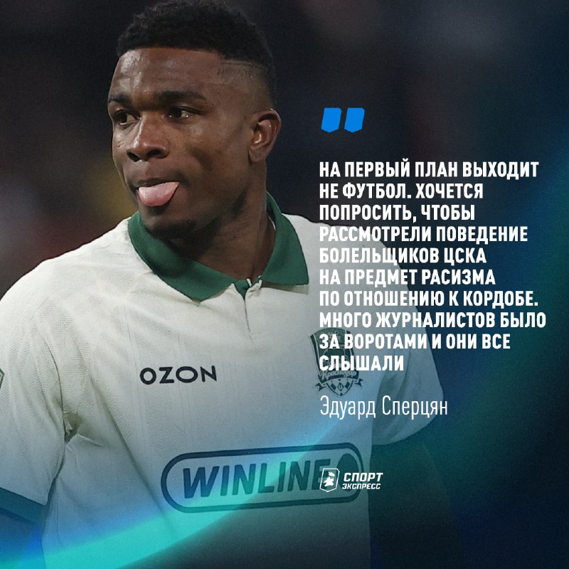 Похоже, вновь скандал... Пальцев добавляет: Не люблю говорить при судейство. Но с трибуны ЦСКА были расистские высказывания в сторону Кордобы, но арбитр не обращает на это внимания. А у нас футболис