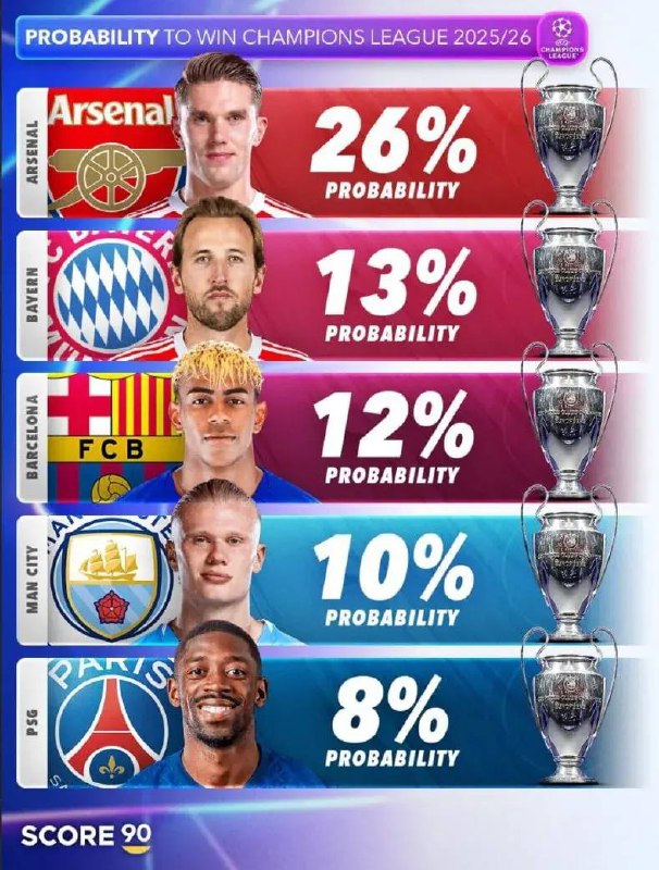 📊 ФАВОРИТЫ ЛИГИ ЧЕМПИОНОВ «Арсенал» с отрывом имеет наибольшие шансы на победу, и оно неудивительно, ведь банда Артеты очень хороша, а с сеткой «канонирам» повезло, а вот «Бавария» уже в 1/4 может в
