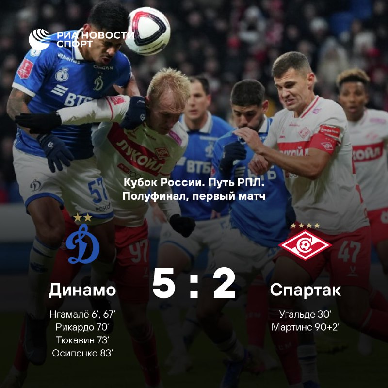⚽️Московское «Динамо» одержало победу над столичным «Спартаком» в первом матче полуфинала пути РПЛ Кубка России по футболу Встреча прошла в Москве на стадионе «Динамо» и завершилась со счетом 5:2 в п
