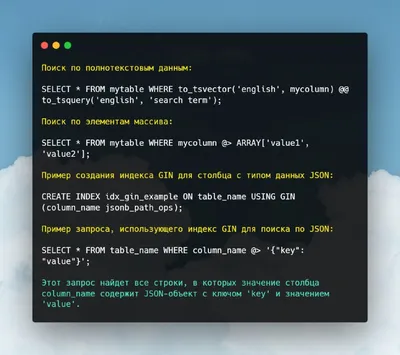 Индекс GIN Индекс GIN - это тип индекса в PostgreSQL, который позволяет эффективно искать данные в полнотекстовых полях, массивах, JSON и других типах данных. Он создается на столбцах с комплексными
