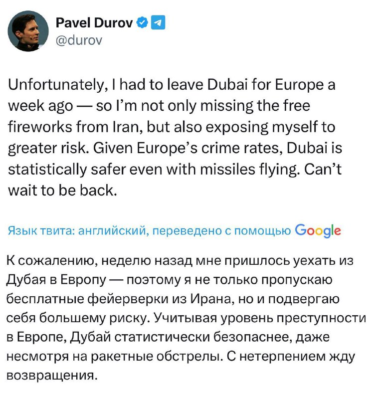 🤷♂️Дуров пожалел, что уехал из Дубая и пропустил иранские «фейерверки». «Учитывая уровень преступности в Европе, Дубай статистически безопаснее, даже несмотря на ракетные обстрелы. С нетерпением ж