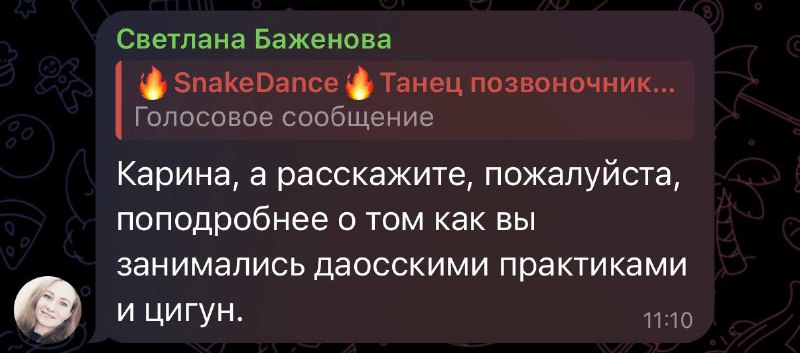 По этой ссылке https://t.me/ssnakedance/2877 история о том, как я начала свой путь принятия себя и раскрытия своей сексуальности. О даосских практиках и цигун, которые легли в основу ЗМЕИНОЙ ПЛАСТИКИ