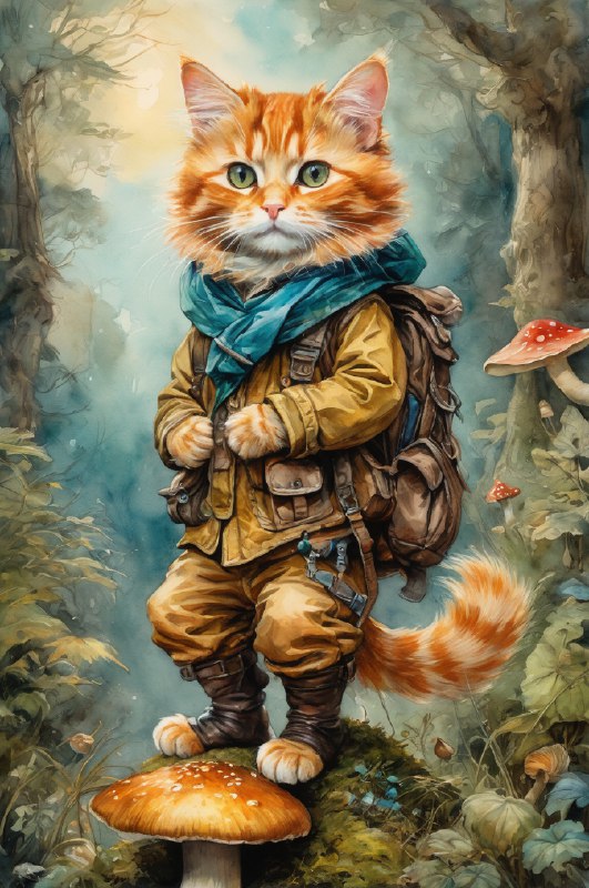 #SDXL #Midjourney 🏛Запрос: charming watercolor painting of an anthropomorphic ginger cat explorer perched atop a vibrant mushroom, wearing a tiny backpack and coat, inspired by arthur rackham, detai