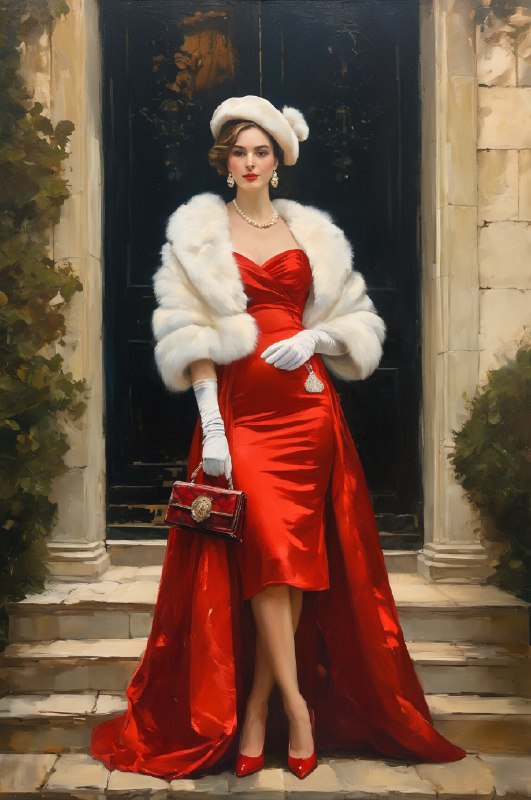 #SDXL #Midjourney 🏛Запрос: a glamorous woman standing in front of a stone manor house, wearing a vibrant red satin dress, white fur stole, white gloves, a white beret, and red heels, holding a red h
