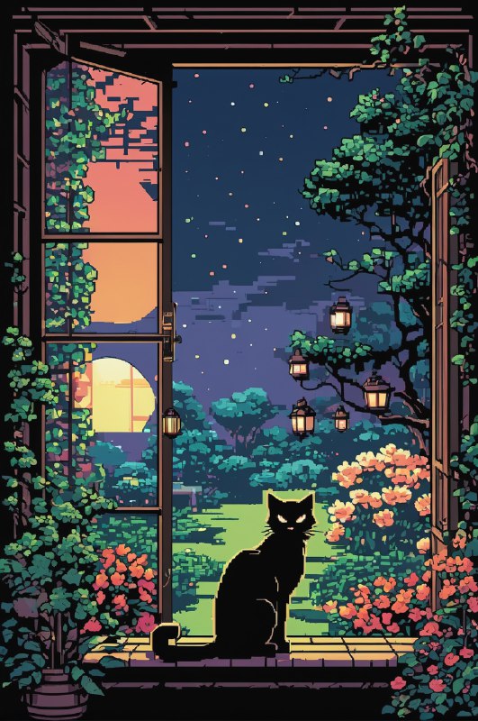 #SDXL #Comics 🏛Запрос: pixel art, anime style, game background, window view of a garden, black cat, glowing lantern, 8-bit, cel-shading, limited color palette