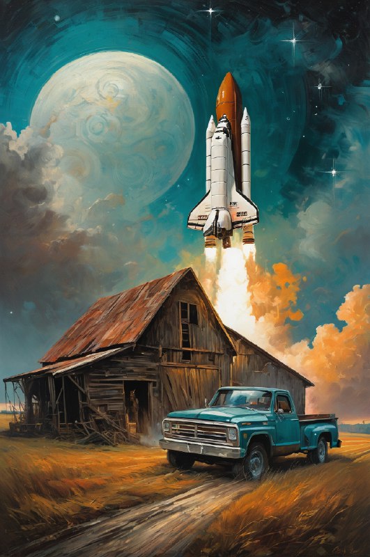 #SDXL #Midjourney 🏛Запрос: the collision of worlds. a space shuttle ascends into the cosmos above a forgotten farm. a weathered barn and a rusting pickup truck witness the spectacle. dramatic, swirl