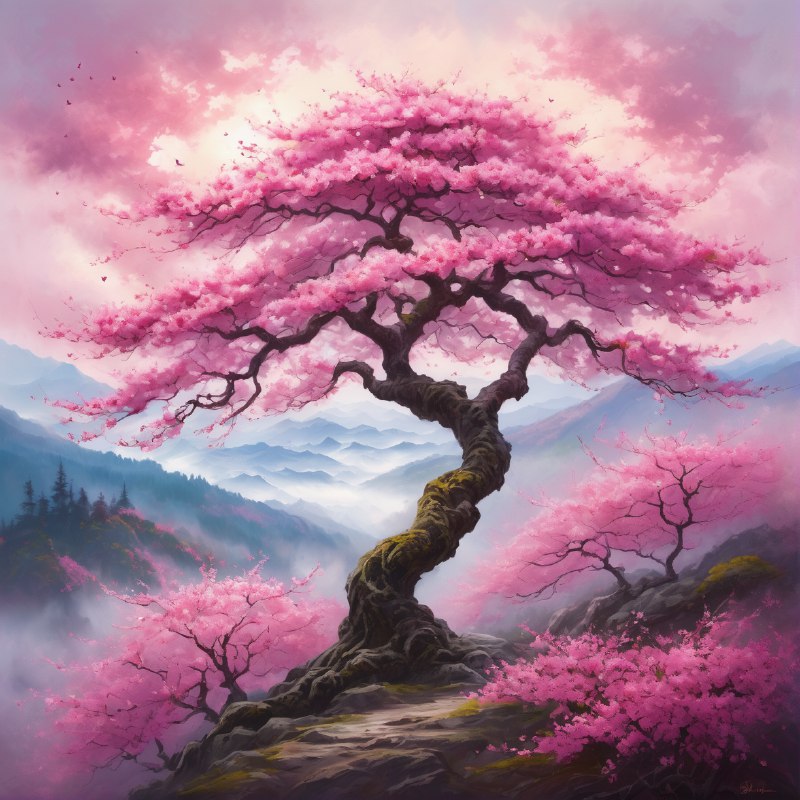 #SDXL #Vanilla 🏛Запрос: breathtaking digital painting of a majestic cherry blossom tree in full bloom. the foreground features large, vibrant pink flowers with delicate petals attached to dark, gnar