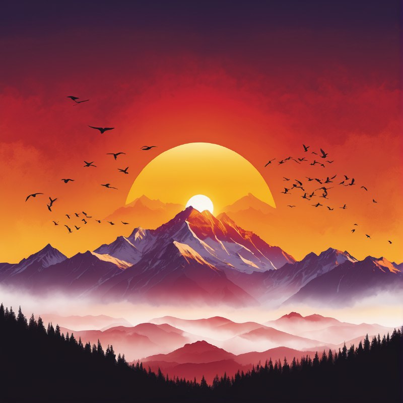 #SDXL #Vanilla 🏛Запрос: high-contrast digital artwork featuring a majestic, snow-capped mountain peak rising from a bed of white mist. directly behind the mountain peak is a massive, perfectly round