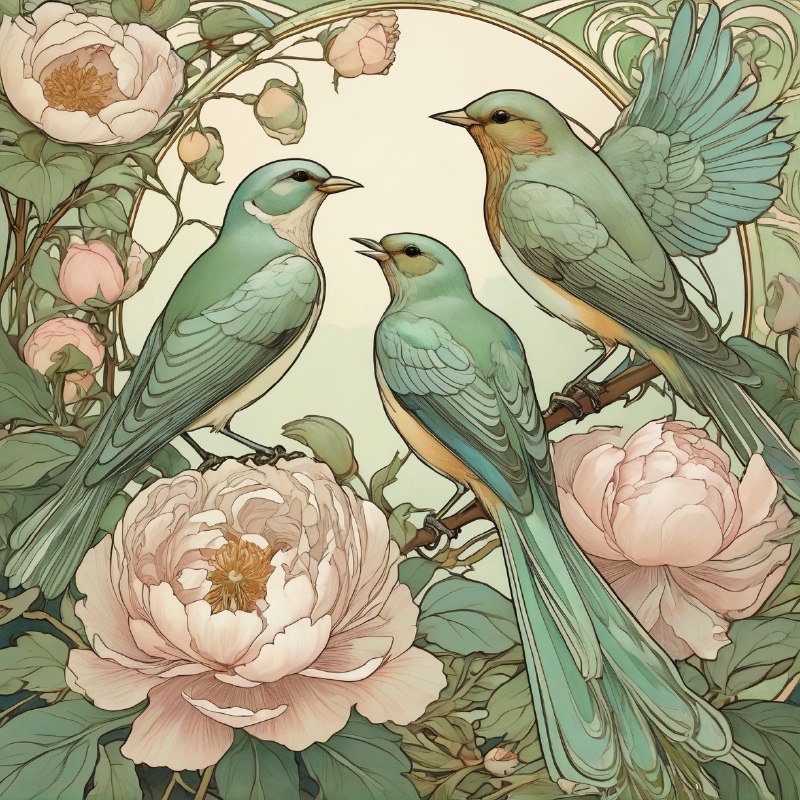 #SDXL #Vanilla 🏛Запрос: an art nouveau masterpiece illustration in the style of alphonse mucha. two delicate songbirds are perched amidst a lush arrangement of large, ruffled peonies and roses. the