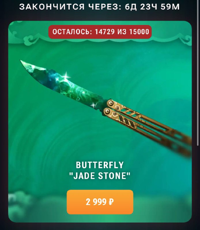 Скин из коллекции «Jade Stone» на нож бабочку Через час в продаже появится первый лимитированный нож — Butterfly “Jade Stone”! ⭐️ Это последний скин из бандла, не упусти возможность добавить классны