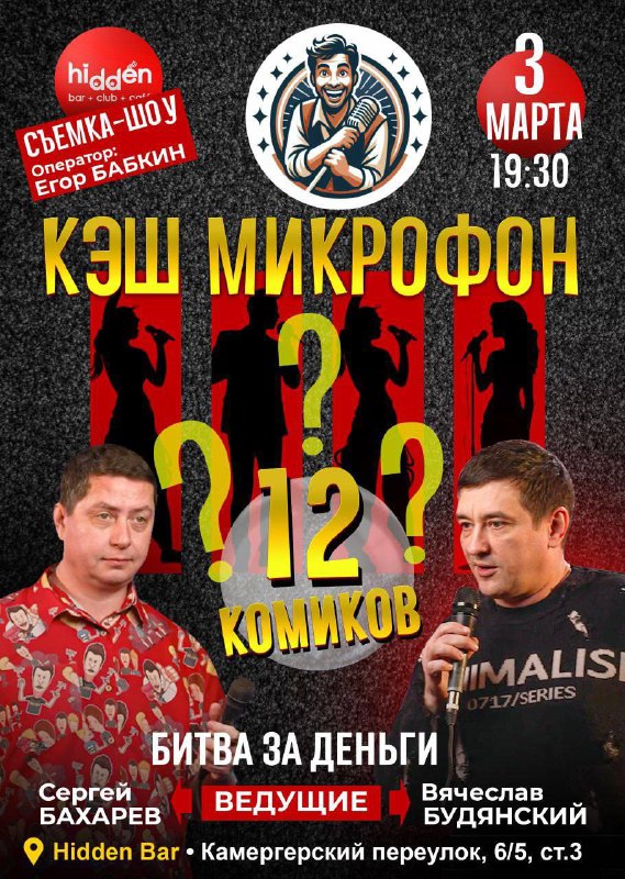 ПОСЛЕЗАВТРА (во вторник) - Съёмка стендап-шоу «Кэш микрофон» в баре «Hidden bar» 12 опытных комиков борются за денежный приз. Только лучшие шутки в этот вечер специально для вас. Это отличный вариант