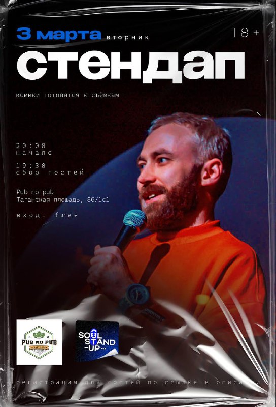 ЗАВТРА (во вторник) - Бесплатный Stand Up в пабе Pub no pub 🔥 Комики из популярных проектов ТНТ, Labelcom и Medium Quality 🔥 Харизматичный ведущий 🎁 Розыгрыш призов для гостей 18+ ⏰Сбор гостей с