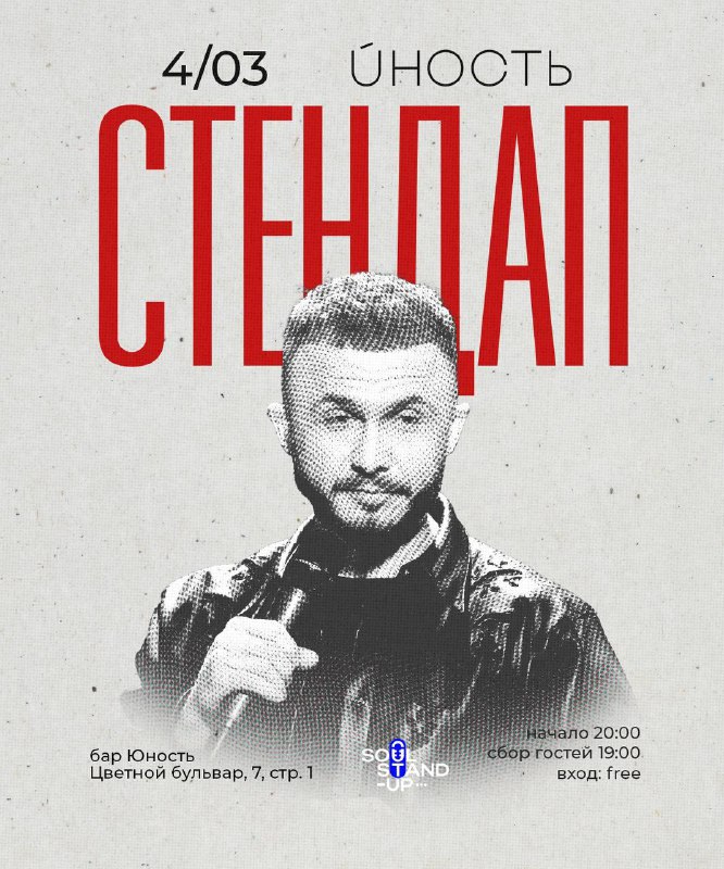 ЗАВТРА (в понедельник) - Бесплатный STAND UP в в SOHO Lounge Bar Участники проектов ТНТ и Medium Quality готовятся к съемкам Ты первый, кто это услышит! 18+ ⏰Сбор гостей с 19:30, начало в 20:00 📍
