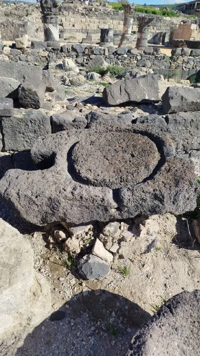 А вот и ответ. Это деталь пресса для оливкового масло. Оливки вначале дробились потом помещались в плоские корзины, которые ставились на такой камень и прессом выдавливали масло. На фотографиях рек