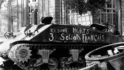 Танк М4 «Шерман», подбитый в Париже. «Здесь погибли 3 французских солдата»- надпись на борту машины.