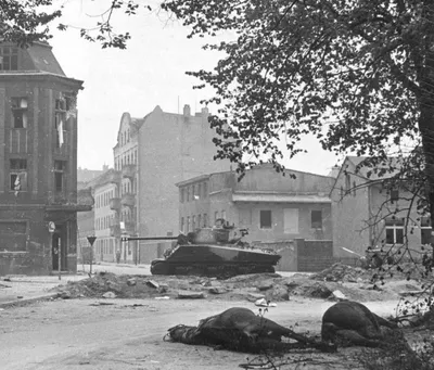 Подбитый советский танк М4А2(76)W «Шерман» в Берлине. Судя по белым тряпкам в окнах- гансы уже капитульнули. Май 1945-го.