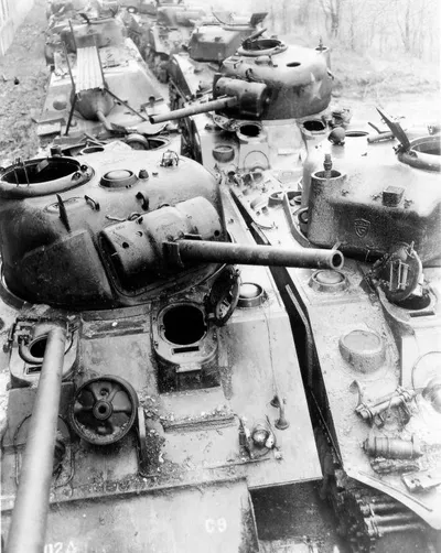 Американский СПАМ с танками М4 "Шерман". Позади виден "Ягдпанцер IV".