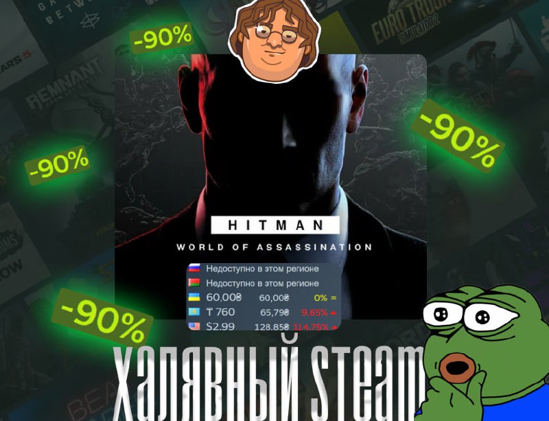 😳 Админ гоняет лысого — HITMAN World of Assassination получила скидку9️⃣0️⃣ Сборник «всего лучшего» из легендарного Хитмэна — Hitman, Hitman 2, Hitman 3, а также режим-рогалик «HITMAN: Фрилансер». П