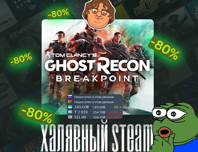 🤗 Ещё одна — Tom Clancy's Ghost Recon Breakpoint получила скидку8️⃣0️⃣ Шутер в открытом мире, где вы становитесь элитным бойцом на враждебном острове. Вам предстоит использовать стелс, адаптировать
