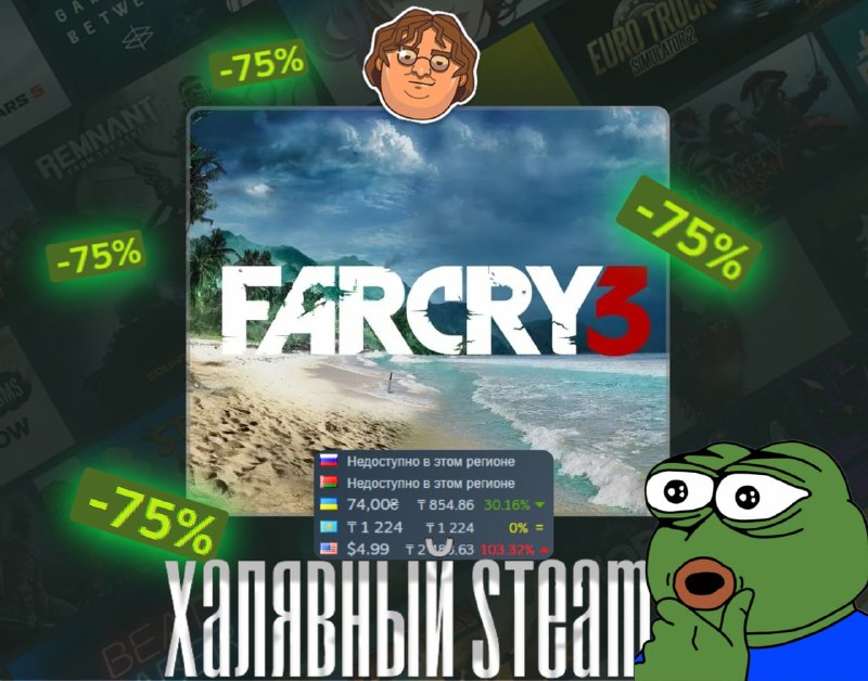 🥃 Far Cry 3 получила скидку7️⃣5️⃣ Легендарная игра из не менее легендарной серии. Экшен-шутер с открытым миром, в котором мы будем спасать своих друзей из лап преступников, которым кишит тропический