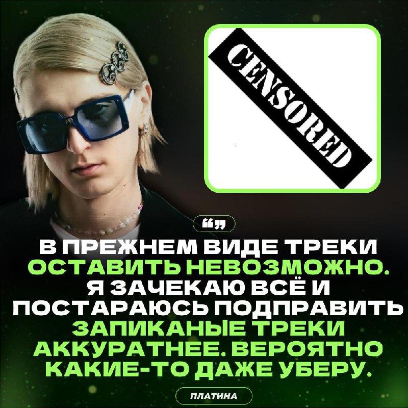 ✔️ ПЛАТИНА ИСПРАВИТ ЗАЦЕНЗУРЕННЫЕ ТРЕКИ! В своих соцсетях Роберт высказался насчет цензуры его треков. Артист сообщил, что поправит треки, чтобы их можно было слушать, но какие-то работы и вовсе удал
